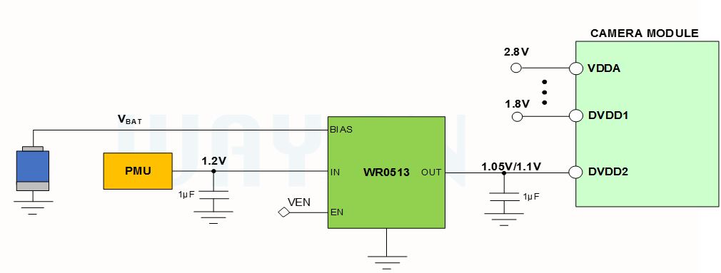對(duì)于要求低Vin的攝像頭模組應(yīng)用,當(dāng)前大部分解決方案是使用輸入1.8V或者1.6V轉(zhuǎn)輸出1.05V/1.1V的LDO,維安的WR0513可以實(shí)現(xiàn)1.2V輸入電源來(lái)提供輸出1.05V或1.1V的解決方案。伴隨著手機(jī)攝像頭數(shù)量的增加,電池可供給的電量和安裝攝像頭的空間都會(huì)受限, WAYON WR0332/WR0341、WR0513系列在兼顧小型化封裝DFN-4 1mm*1mm*0.4mm的同時(shí)能夠很好的解決功耗和供電問(wèn)題