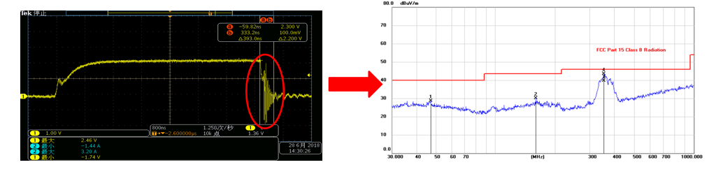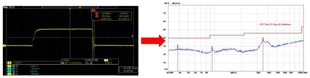 由圖2、圖3可知,振蕩輕微的EMI輻射裕量高出約6dB。