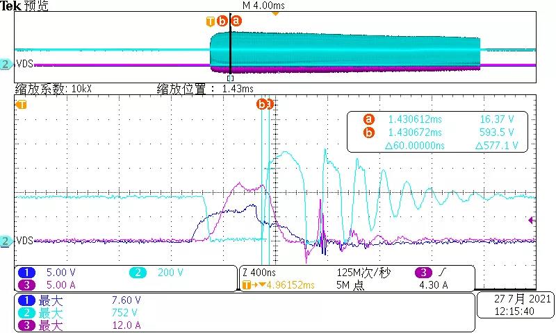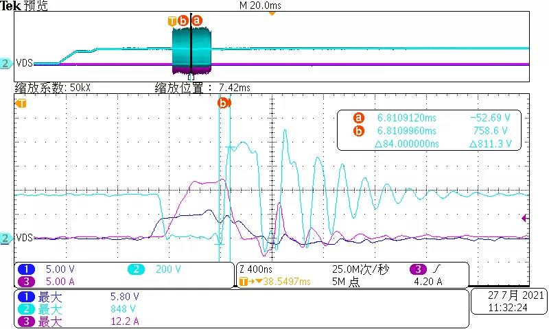 從圖9,10可以看出跨導(dǎo)較小的器件型號(hào)2,短路啟動(dòng)VDS漏源電壓最大752V,而跨導(dǎo)較大的器件VDS漏源電壓最大848V.