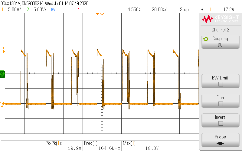 在某款電源動(dòng)態(tài)測(cè)試時(shí)發(fā)現(xiàn)異常比例偏高,經(jīng)過(guò)仔細(xì)測(cè)試分析發(fā)現(xiàn)該電源主開(kāi)關(guān)管存在嚴(yán)重振蕩現(xiàn)象如下圖4。圖4、圖6中通道1是MOSFET VGS柵源驅(qū)動(dòng)電壓波形。圖4中發(fā)現(xiàn)MOSFET出現(xiàn)反復(fù)的開(kāi)通和關(guān)斷。