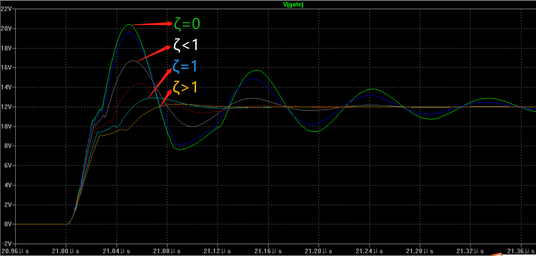 圖13 驅(qū)動(dòng)電路的阻尼比ζ 不同對(duì)應(yīng)的柵源驅(qū)動(dòng)波形仿真圖