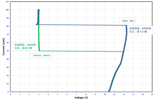 如圖2所示,通過(guò)輸入增加電流可以測(cè)試得到SCR結(jié)構(gòu)TVS進(jìn)入閂鎖狀態(tài)的導(dǎo)通電壓(VBO)和導(dǎo)通電流(IBO),降低電流可以測(cè)試得到退出閂鎖狀態(tài)的維持電壓(VHOLD)和維持電流(IHOLD),TVS整體可提供低至1V~3V的鉗位電壓。