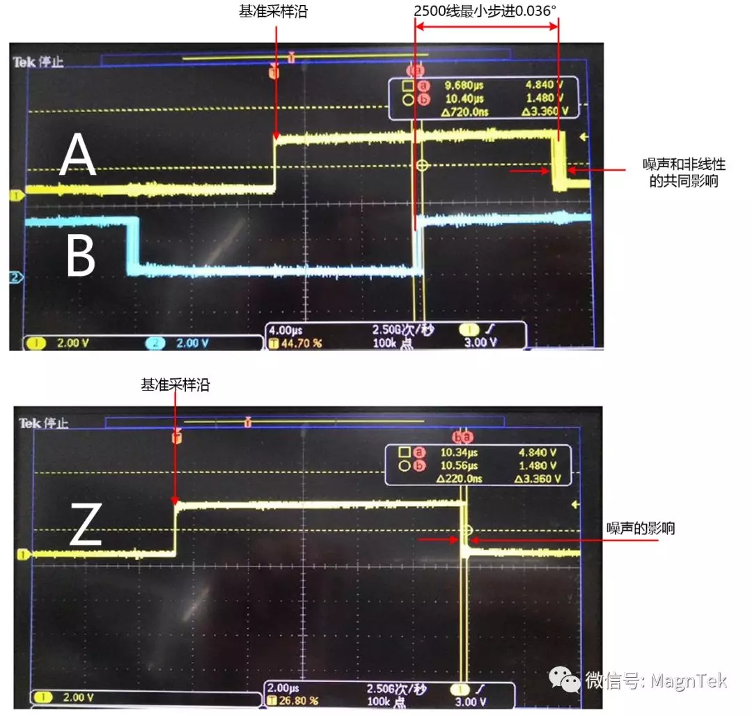 圖1.  MT6825在AB=2500線分辨率,轉速=600轉/分鐘下實測的ABZ輸出噪聲