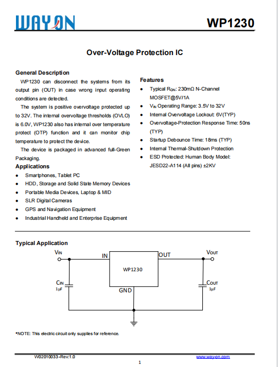 OVP過壓保護芯片主要特征:如果檢測到錯誤的輸入操作條件,WP 1230可以斷開系統(tǒng)與其輸出引腳(OUT)的連接。該系統(tǒng)具有高達32V的正過電壓保護,內部過電壓閾值(OVLO)為6.0V,WP 1230還具有內部過溫保護(OTP)功能,并可監(jiān)控芯片溫度以保護器件。該設備是封裝在先進的綠色包裝。