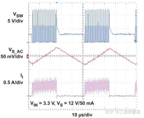 第三行是電感的充放電電流波形,可以看到PFM模式下,電感間歇性的充放電波形,而PWM模式的電感是連續(xù)的充放電,這也可以作為區(qū)分PFM和PWM模式的標(biāo)志。